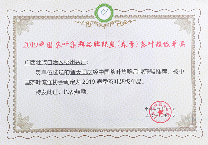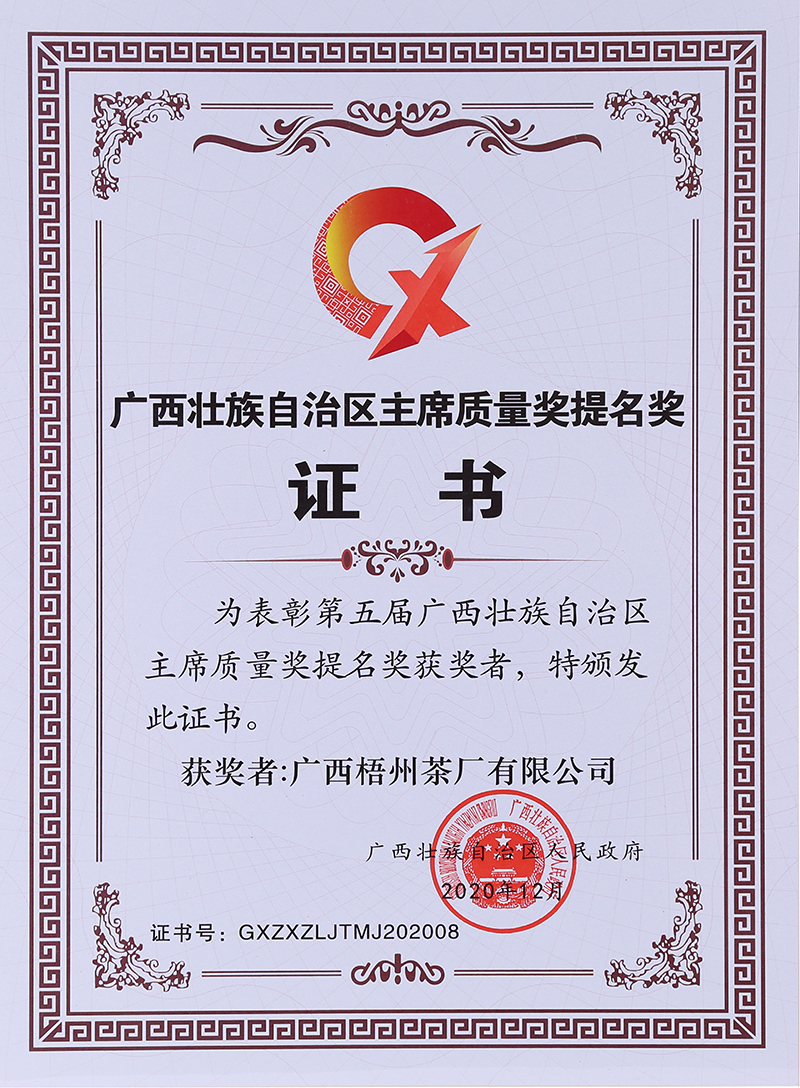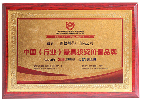 先進(jìn)的工藝、獨(dú)特的環(huán)境、堅(jiān)守的匠心,終獲市場(chǎng)肯定,茶友追捧。梧茶公司先后榮獲“中國茶葉學(xué)會(huì)茶葉科技示范基地”“國家知識(shí)產(chǎn)權(quán)優(yōu)勢(shì)企業(yè)”“高新技術(shù)企業(yè)”“全國實(shí)施卓越績(jī)效模式先進(jìn)企業(yè)”“廣西農(nóng)業(yè)產(chǎn)業(yè)化重點(diǎn)企業(yè)”“廣西文化產(chǎn)業(yè)示范基地”等,三鶴六堡茶是“國家生態(tài)原產(chǎn)地保護(hù)產(chǎn)品"“國家地理標(biāo)志保護(hù)產(chǎn)品”“中國黑茶(六堡茶)標(biāo)志性品牌”,榮獲“第三屆梧州市市長質(zhì)量獎(jiǎng)”“第五屆廣西壯族自治區(qū)主席質(zhì)量獎(jiǎng)提名獎(jiǎng)”等榮譽(yù)。